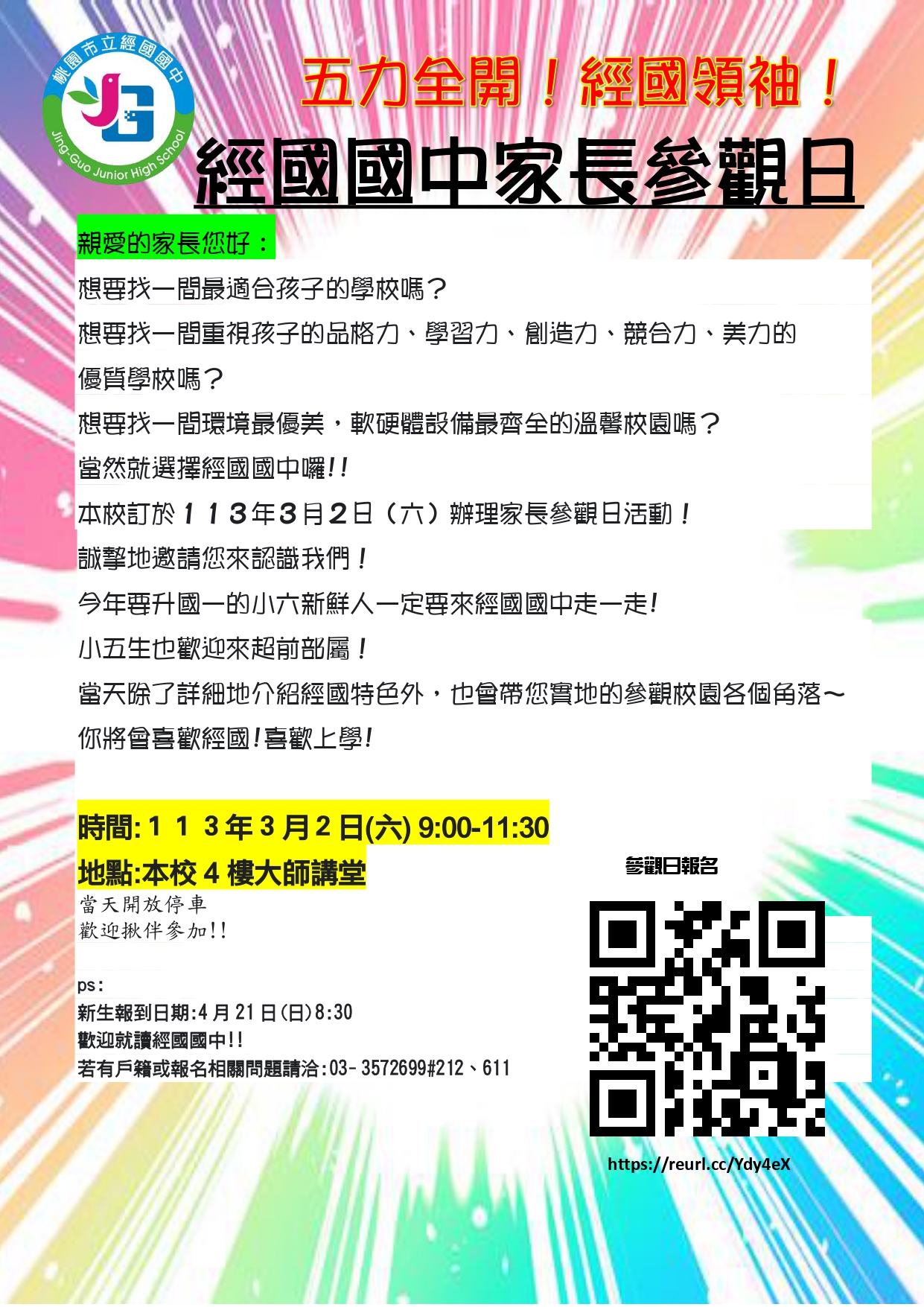 | 一、 | 本校訂於113年3月2日(六)上午9:00至11:30辦理新生家長參觀日,歡迎現就讀小六或小五的學生家長報名參加。 |
