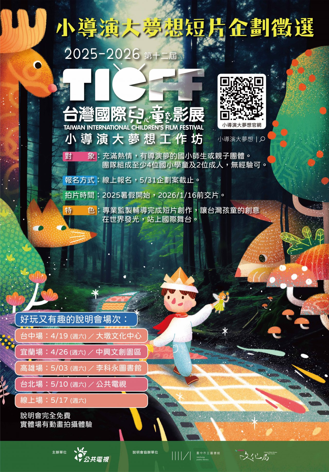 | 三、 | 「兒童短片企劃案徵選」於2025/5/31截止收件,歡迎國小師生、親子團隊組隊上網報名。提出拍片企劃參加徵選,入選團隊可享整套拍片輔導資源,完成短片擇優送國際參展。相關活動細節請上活動官網 https://www.pts.org.tw/dreamer12/ |