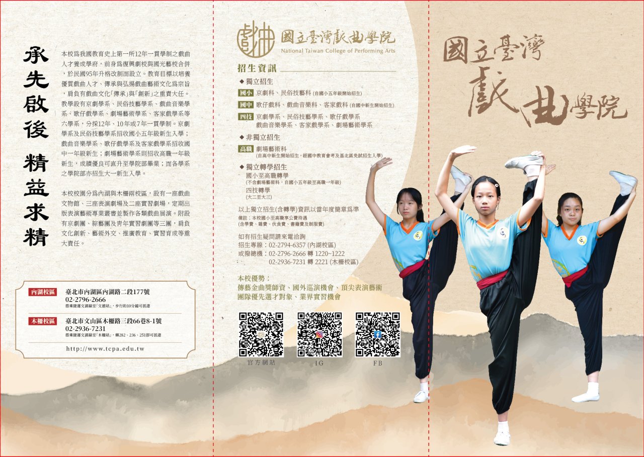 十、 其它多元招生訊息請關注「國立臺灣戲曲學院招生資訊」臉書粉絲專頁(https://www.facebook.com/NTCPA.Information),亦可參考嘎校宣傳影片《劇校生的一天》(https://youtu.be/MbvBRcYr_u8?si=_v-OXf0POchqaPXn)。