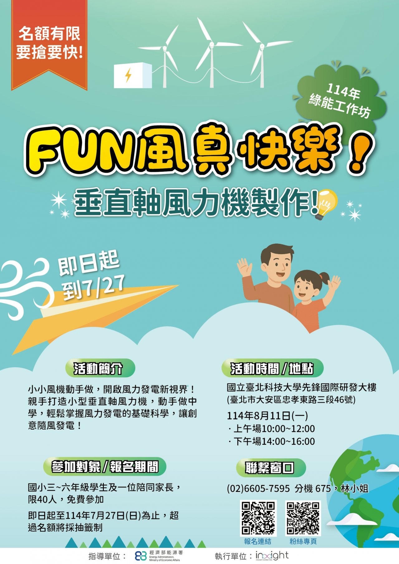 | 主旨: | 有關經濟部能源署舉辦114年度「FUN風真快樂!綠能工作坊-垂直軸風機製作」活動一案,詳如說明,請查照。 |
