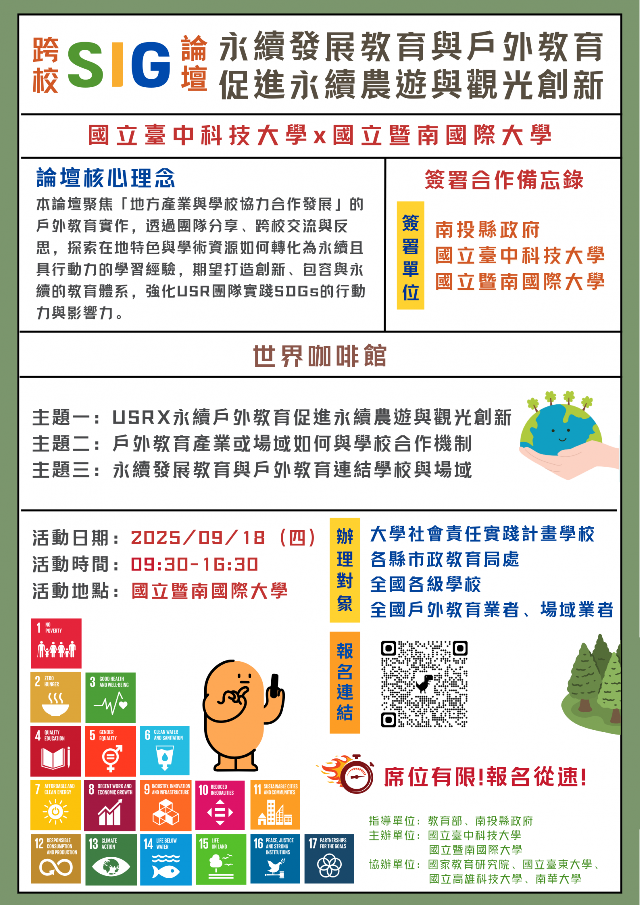 | 主旨: | 轉知國立臺中科技大學聯合國立暨南國際大學主辦「永續發展教育與戶外教育促進永續農遊與觀光創新」USR跨校SIG論壇資訊,請查照。 |