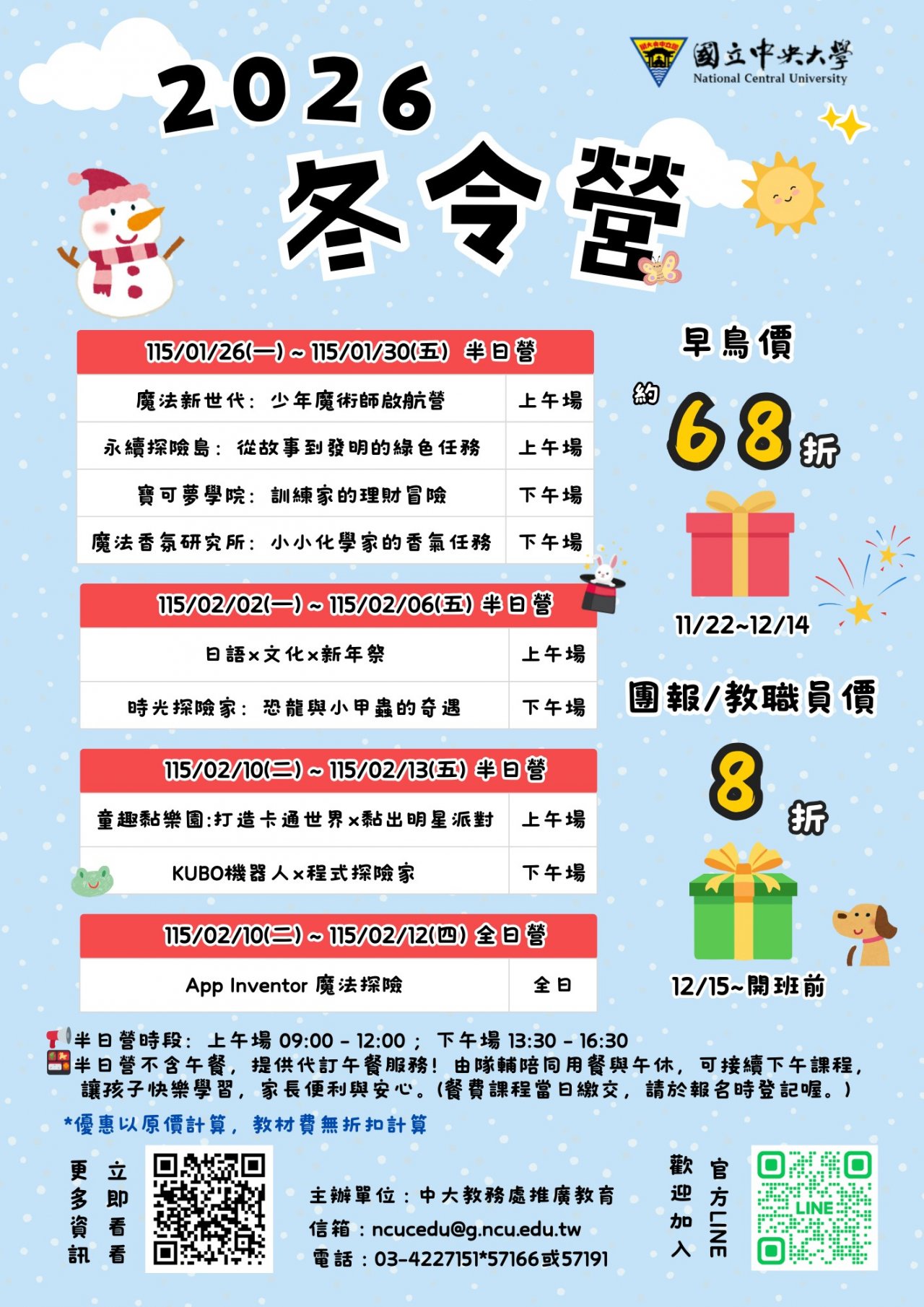 | 一、 | 為豐富國小學童之寒假活動,並提供多元優質學習內容,本校推出「2026 冬令營」,課程涵蓋科學、程式、藝文、永續、語言文化等主題,結合情境任務與創意實作,期能帶領學童在寒假期間持續探索學習的樂趣,提升多元能力與素養。 |