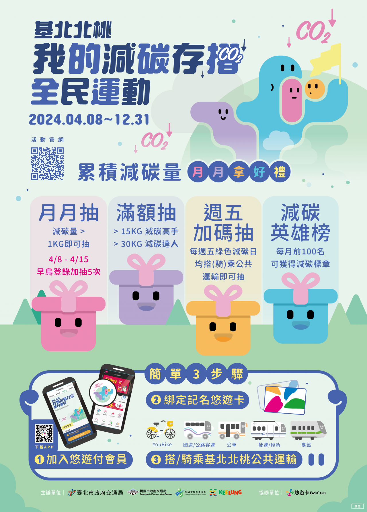 | 二、 | 為鼓勵民眾搭乘大眾運輸減少私人運具的使用以達到節能減碳,由臺北市政府交通局、新北市政府交通局、基隆市政府交通處及本府交通局共同主辦「基北北桃-我的減碳存摺全民運動」(官方網站:https://co2-passbook.com/) |