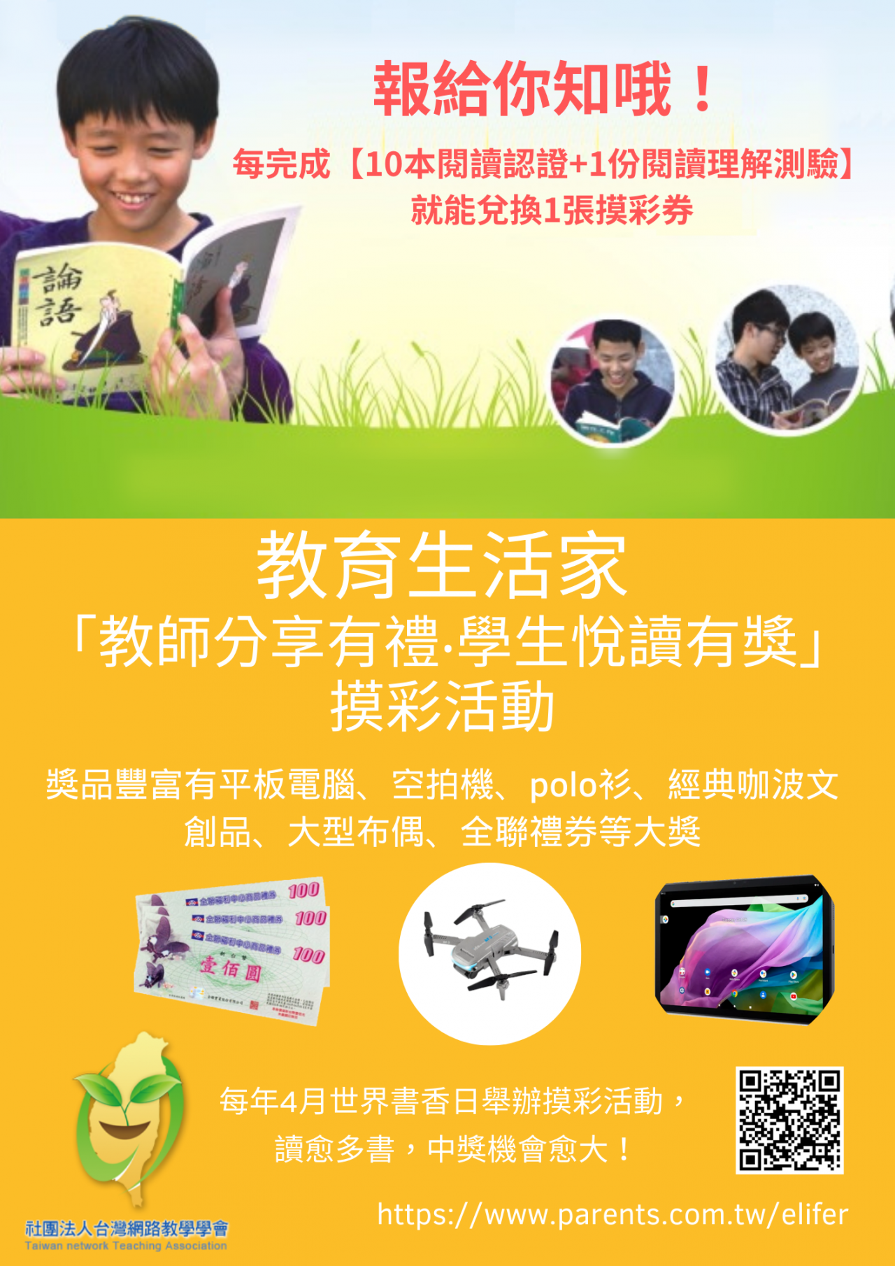 | 主旨: | 今年4月23日世界書香日「教育生活家」網站又要舉辦「教師分享有禮‧學生悅讀有獎」摸彩活動,獎品豐富,讀愈多書,中獎機會愈大,敬請傳達給貴校導師、學生家長,激勵學生把握機會閱讀,得大獎。 |