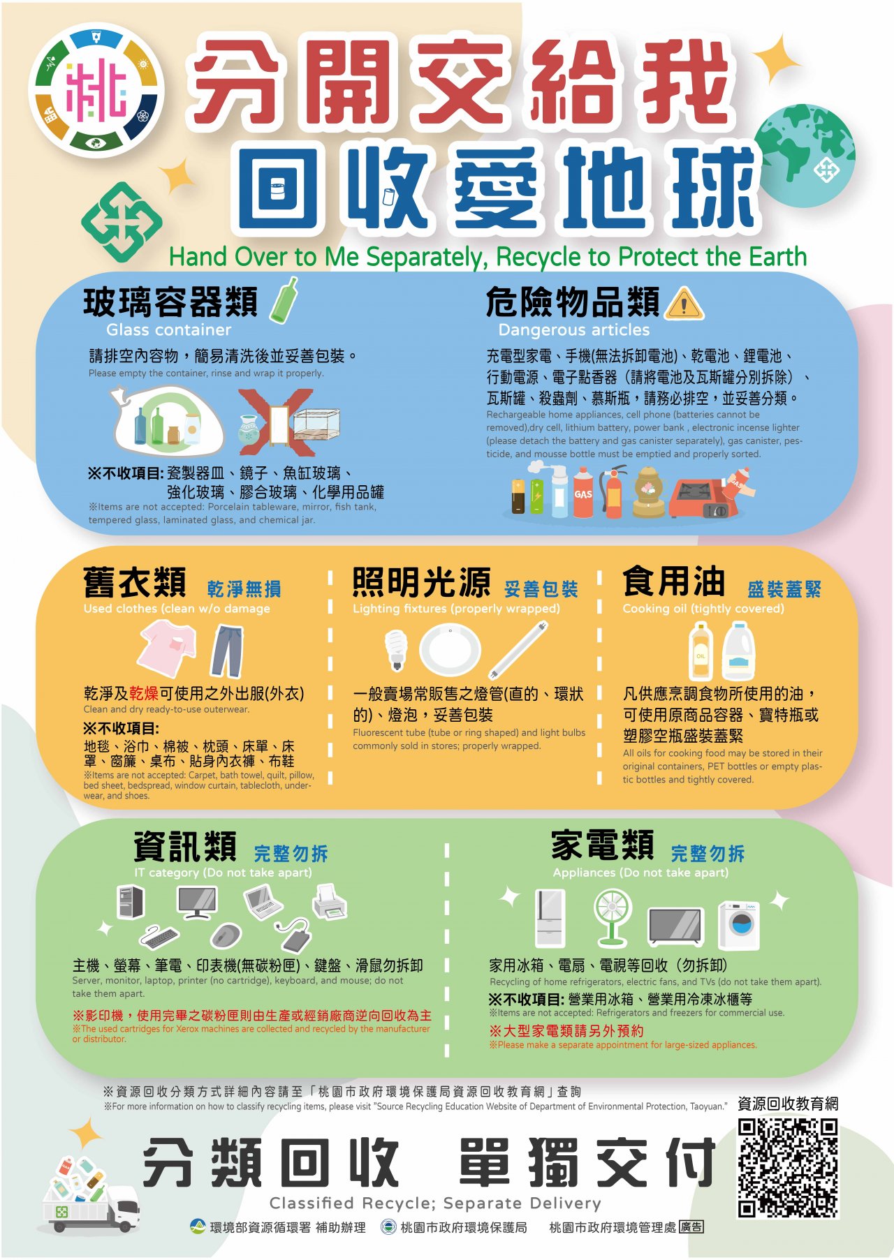 | 三、 | 有關垃圾分類、資源回收及廚餘回收之相關資訊,可至本府環境保護局資源回收教育網站查詢,網址:https://recycle.tyoem.gov.tw,請推廣週知並踴躍參考使用。 |