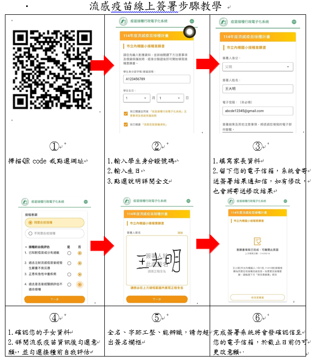 請您掃描QR Code或點選網址填寫施打意願並簽名(全名、字跡工整、能辨識,請勿超出簽名欄框,以便現場核對),意願調查截止日期為114年09月30日 (星期二23:59),同意或不同意接種皆須填寫,於截止期限前,您都能透過上述方式登入簽署網頁修改接種意願,家長如有填寫電子郵件,於簽署後將由系統寄送簽署結果通知信,謝謝您的配合與協助。操作說明可參考下列操作示範影片及附件。