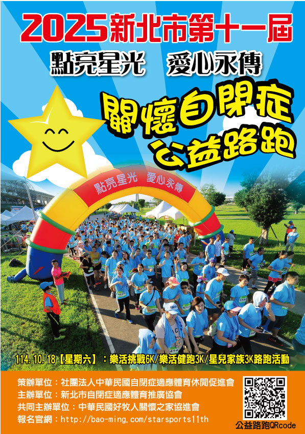 | 主旨: | 檢送自閉症適應體育促進會策畫辦理2025新北市第十一屆“點亮星光、愛心永傳”關懷自閉症公益路跑活動簡章〈DM〉乙份,詳如附件及說明,懇請協助公告及轉知貴校所屬成員,鼓勵踴躍報名參加! |