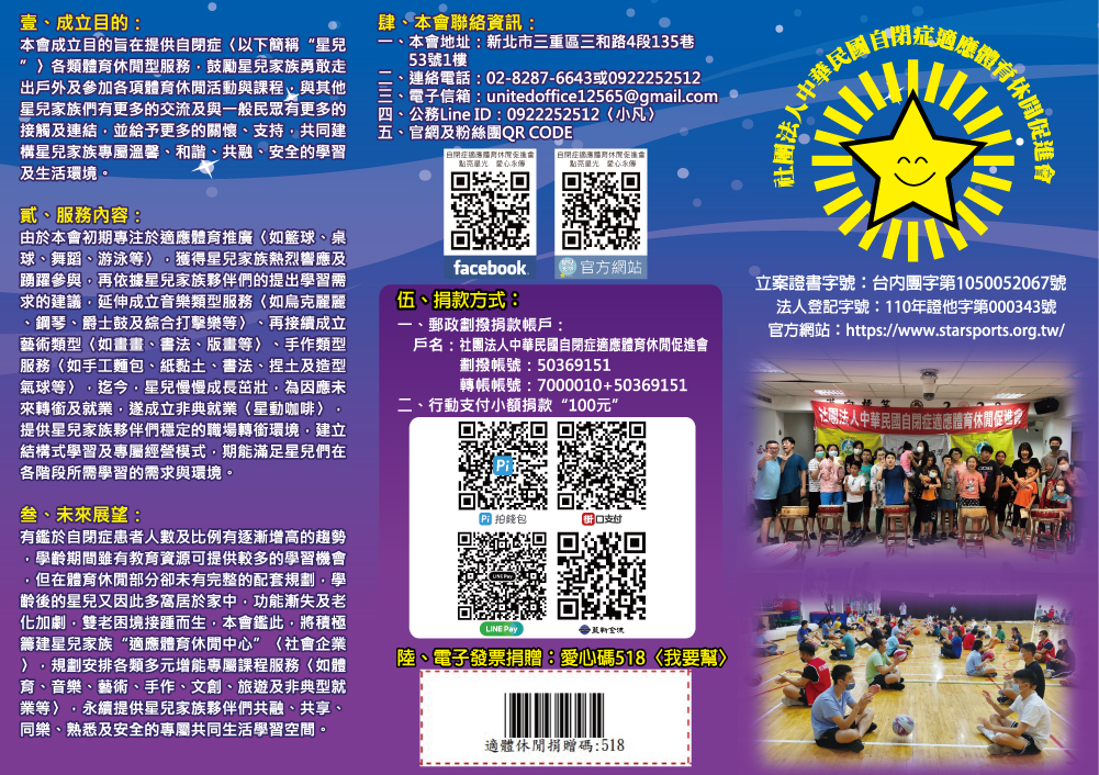 | 二、 | 本會長期致力於自閉症者〈以下簡稱“星兒”〉各項體育〈籃球、桌球、水適能、舞蹈等〉及休閒〈藝術創作、音樂培養、手作工藝等〉等服務,期能提供星兒家庭專屬合適的學習環境,不斷成長〈簡介單張如附件一〉。 |