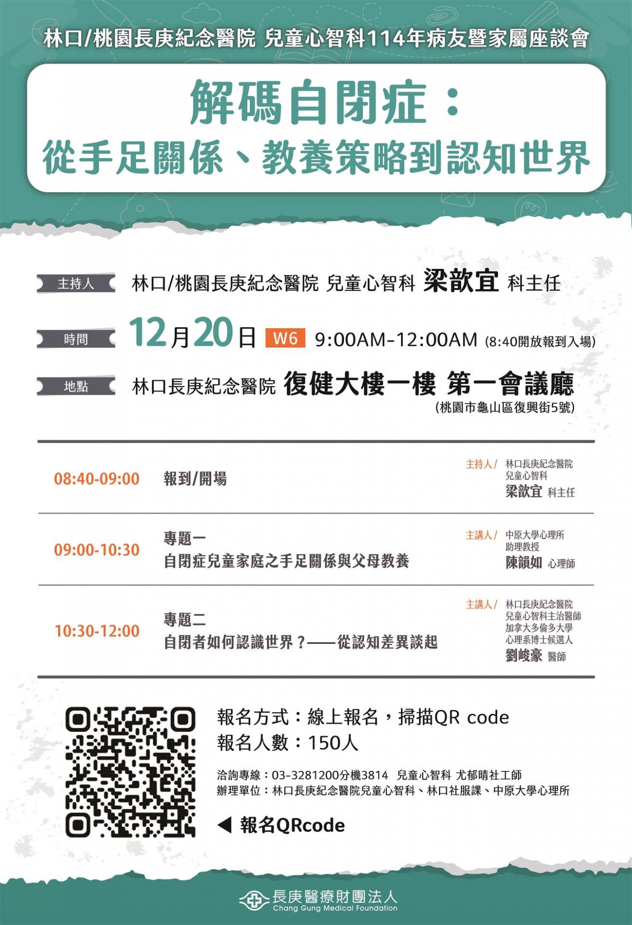 | 主旨: | 轉知長庚醫療財團法人林口長庚紀念醫院(以下稱長庚醫院) 辦理兒童心智科病友暨家屬座談會「解碼自閉症:從手足關係、教養策略到認知世界」一案,請查照。 |