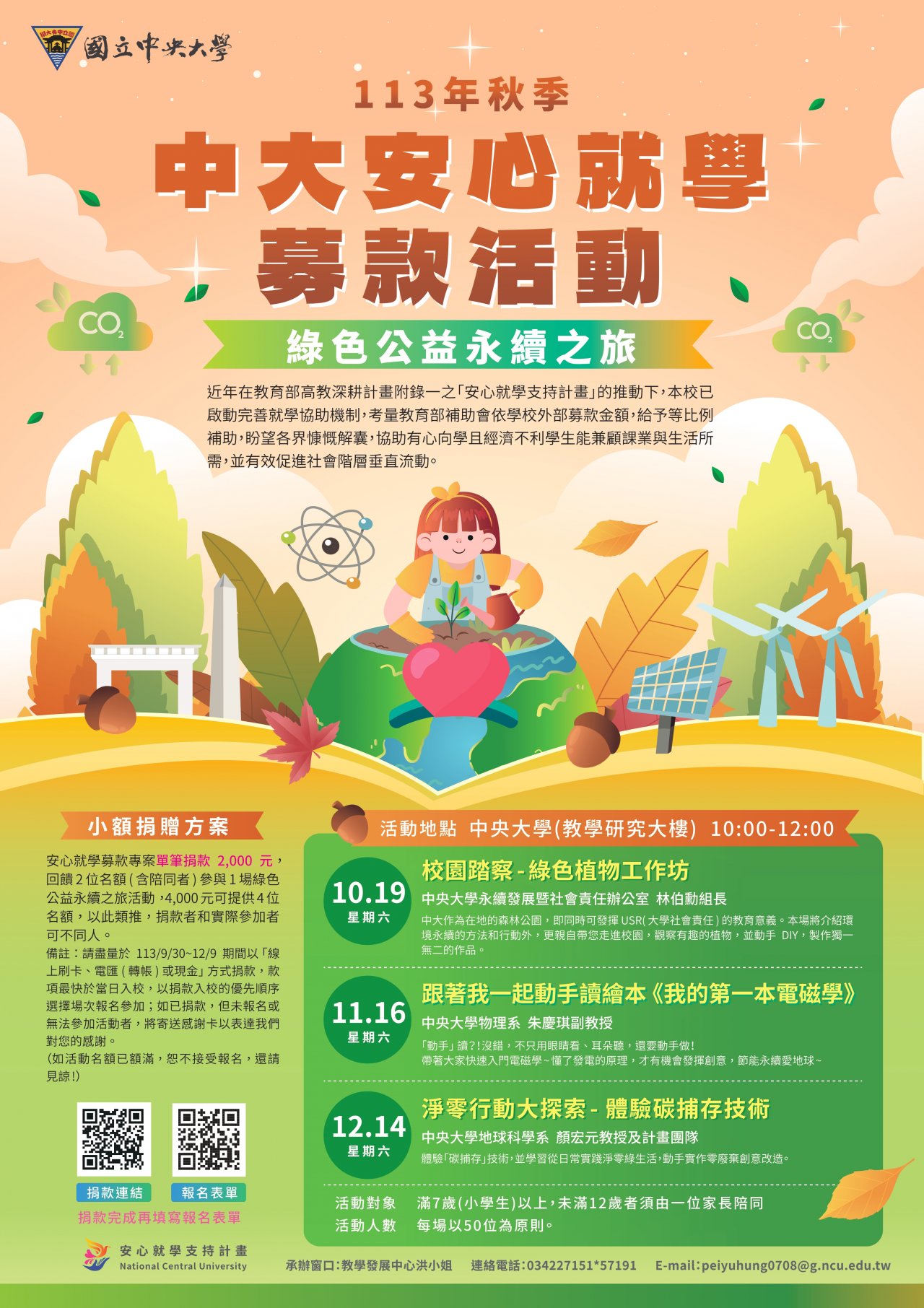 主旨: 本校辦理「113年秋季中大安心就學募款-綠色公益永續之旅」,敬請協助宣傳,詳如說明,請查照。
