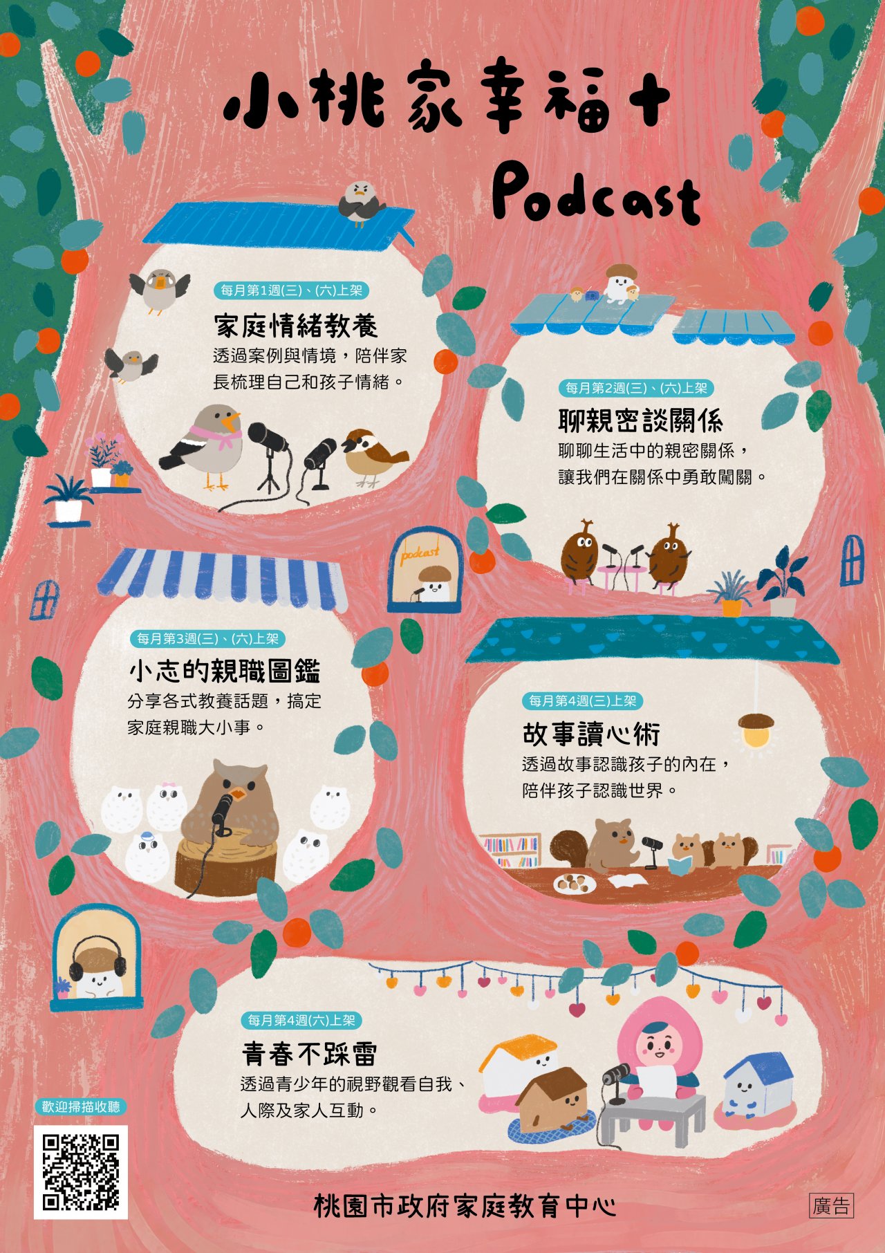 | 檢送本中心「小桃家幸福+Podcast」、「蛇來蛇去家和樂聚過好年」海報1份,惠請貴機關(學校)運用多元管道宣導,請查照。 |