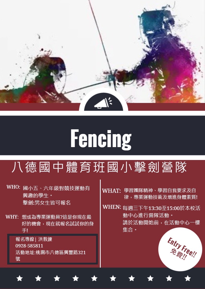 | 一、 | 為提供八德國中體育班團隊資源予市內各國小,採營隊方式進行校際合作與體育交流,藉以開拓國小學生對擊劍運動的基礎知能,為有興趣參與擊劍運動的國小學童進行轉銜國中體育班之準備。 |