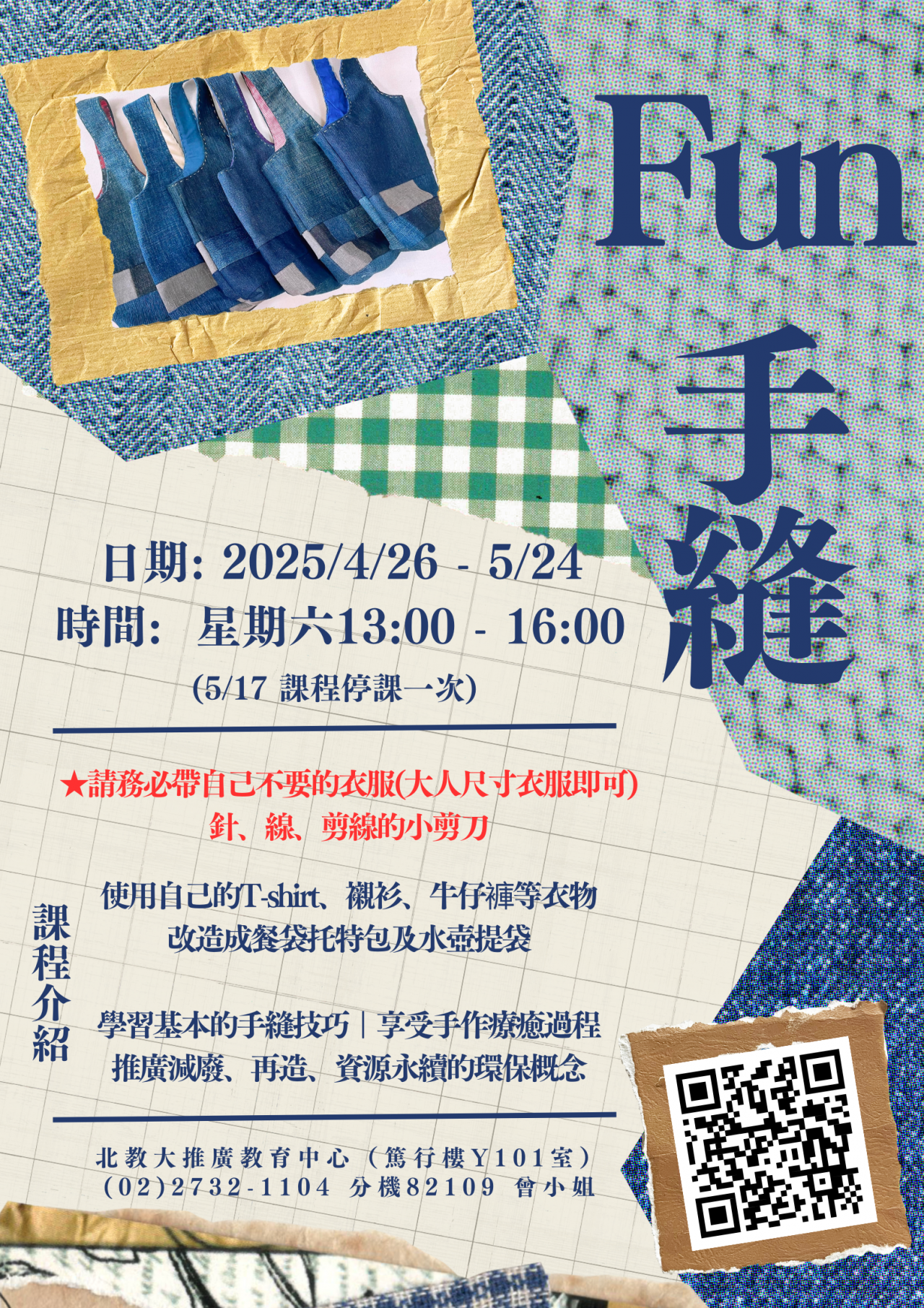 主旨: 本校推廣教育中心辦理「Fun手縫(HandMay五月場)」縫紉課程招生訊息,鼓勵踴躍報名參加,請查照。