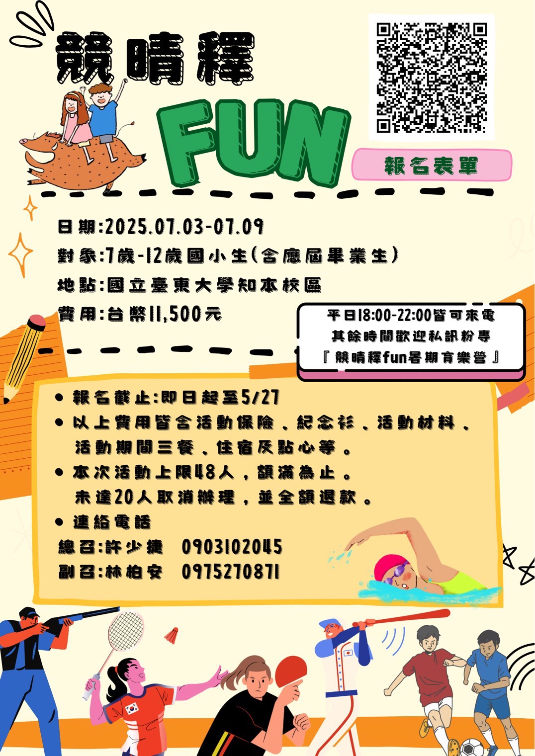| 二、 | 本案倘有疑問,請逕洽國立臺東大學競技與運動科學學系活動總召許少捷(電話:0903102045)或林柏安(電話:0975270871),個人資料請依個人資料保護法及其施行細則等相關規定辦理。 |