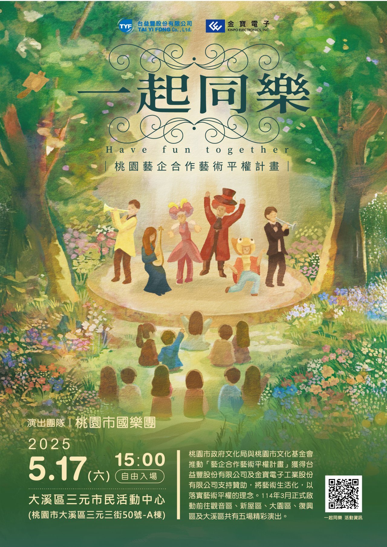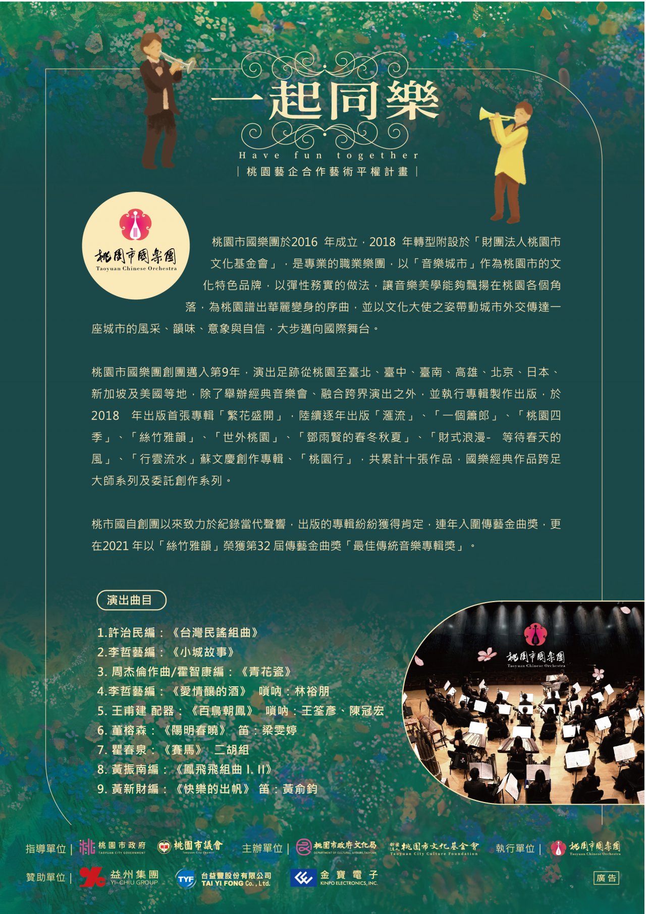 | 一、 | 本活動預定於114年5月17日(星期六)下午3時,邀請「桃園市國樂團」於大溪區三元市民活動中心(桃園市大溪區三元三街50號-A棟)辦理演出。 |