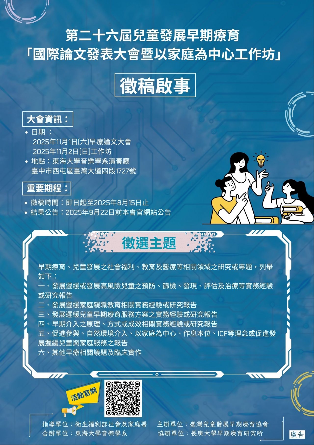 | 主旨: | 函轉臺灣兒童發展早期療育協會辦理「第26屆兒童發展早期療育國際論文發表大會暨以家庭為中心工作坊」徵稿啟事及活動單一案,請各校(園)踴躍投稿,請查照。 |