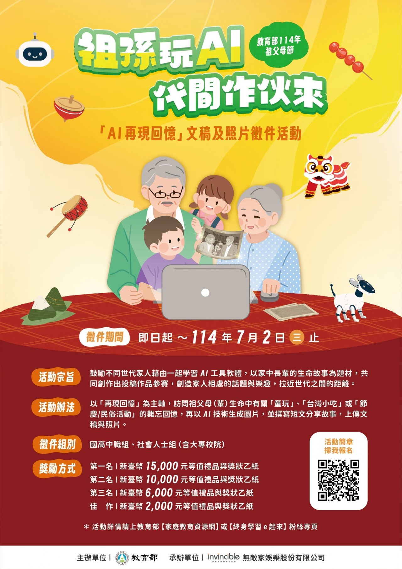 | 函轉教育部「114年度祖父母節『AI再現回憶』文稿及照片徵件活動」簡章及海報(皆為電子檔),請協助推廣宣傳並鼓勵所屬踴躍投件,請查照。 |