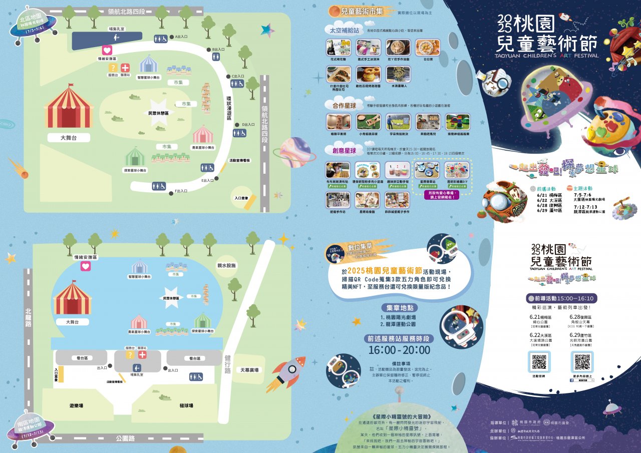 一、 本局為推廣兒童藝術啟蒙與在地藝文紮根,規劃辦理「2025 桃園兒童藝術節」,活動內容包含前導演出、兒童市集、小型表演 、主舞台大型演出,辦理時間及地點如下:
