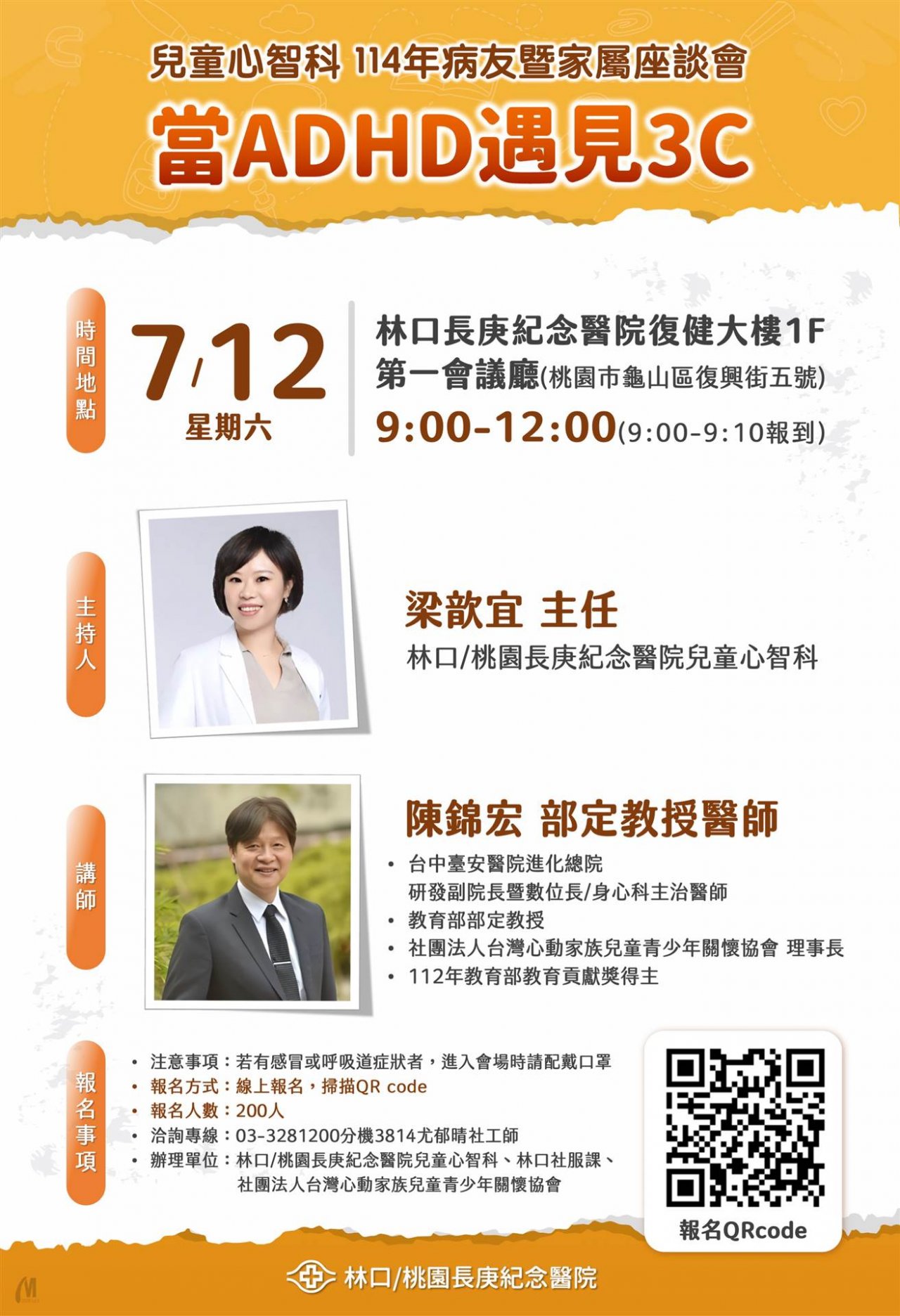 | 主旨: | 轉知長庚醫療財團法人林口長庚紀念醫院(以下稱長庚醫院) 辦理兒童心智科病友暨家屬座談會「當ADHD遇見3C」一案,請查照。 |