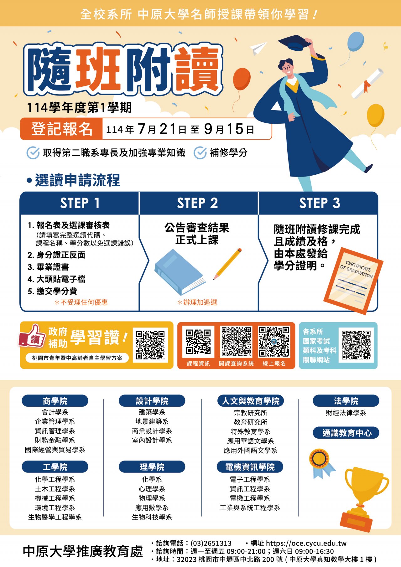 | 一、 | 本校開放114學年度第1學期學士、碩士學分專班(隨班附讀),報名登記至114年9月15日止。 |