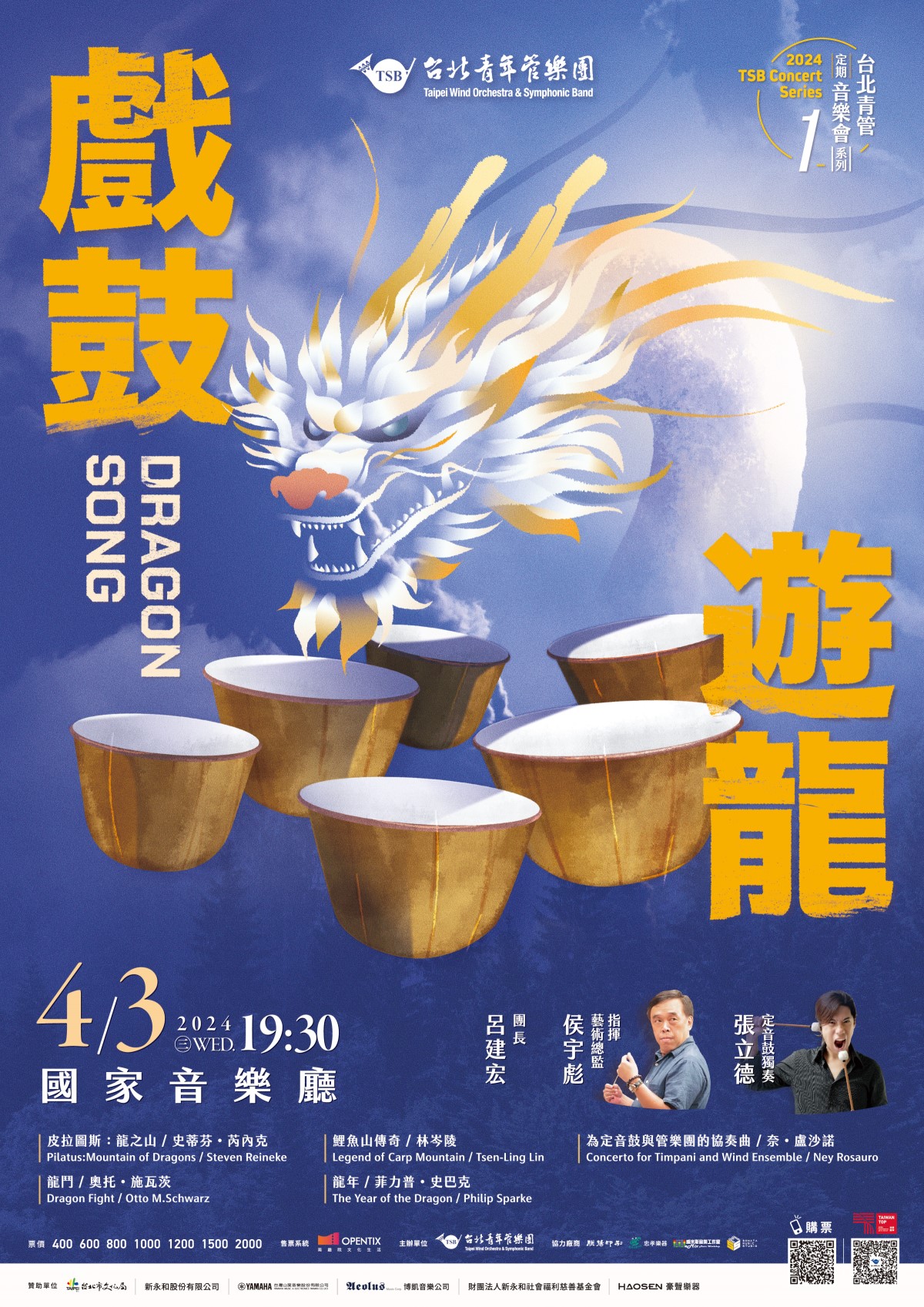 一、 2024台北青管定期音樂會系列I,由侯宇彪教授指揮台北青年管樂團演出;帶來多首與東西方神獸龍有關之樂曲,氣勢磅礡。並邀請廣州交響樂團定音鼓首席張立德擔任協奏曲獨奏,精彩可期。