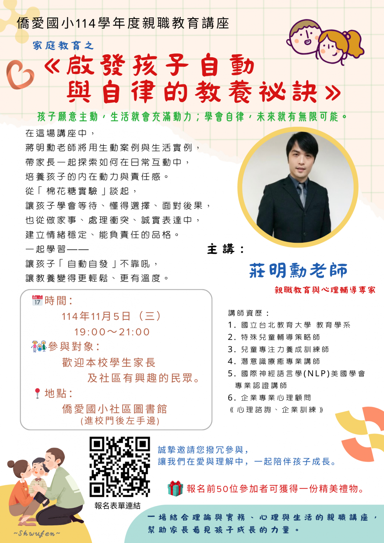 | 「114學年度教育優先區親職教育講座」,歡迎教師、家長及社區人士踴躍參加。 |