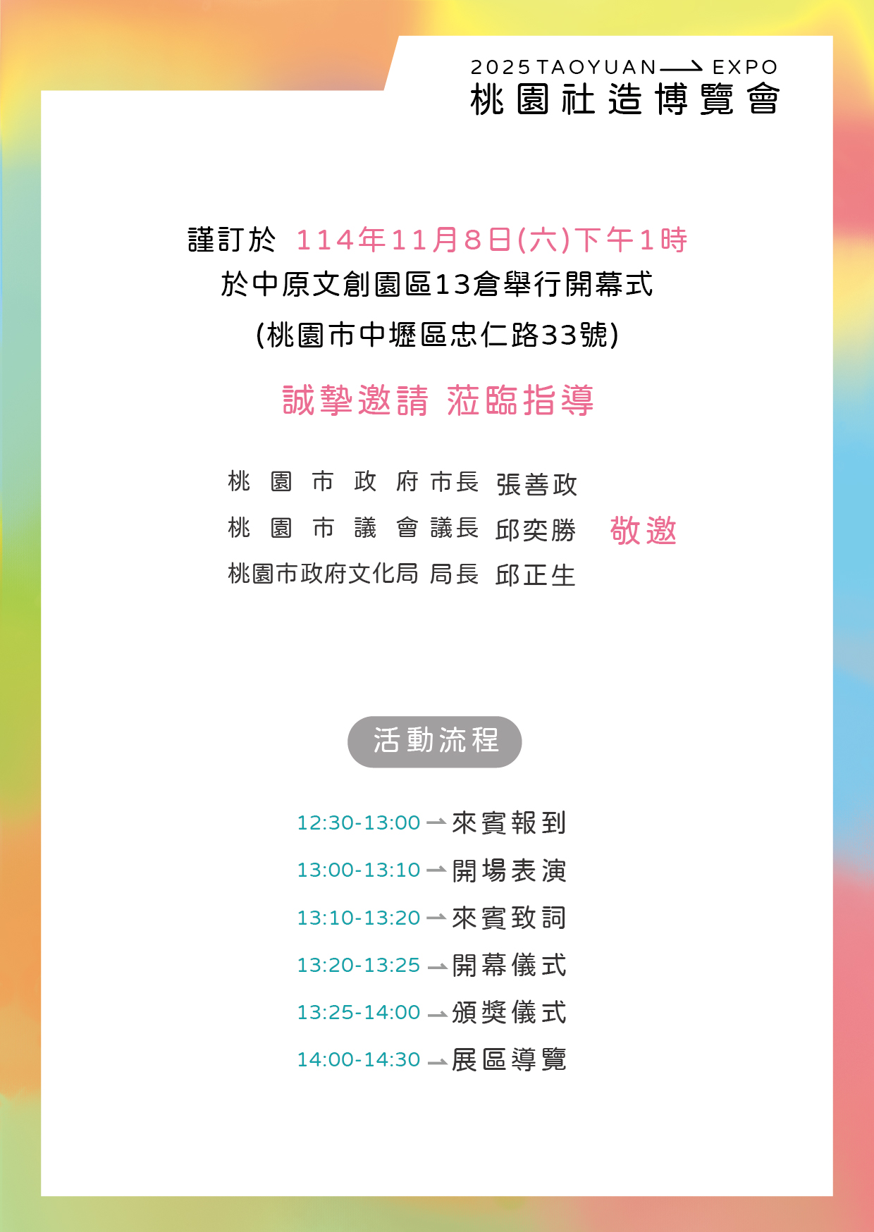 | 主旨: | 檢送本局辦理「2025桃園社造博覽會-桃園社造.zip解壓中」活動海報及開幕式邀請卡各1份,敬請貴單位協助宣傳並踴躍參加,請查照。 |