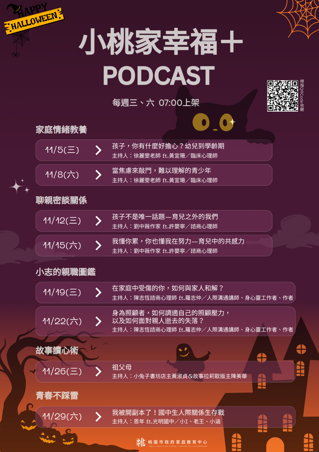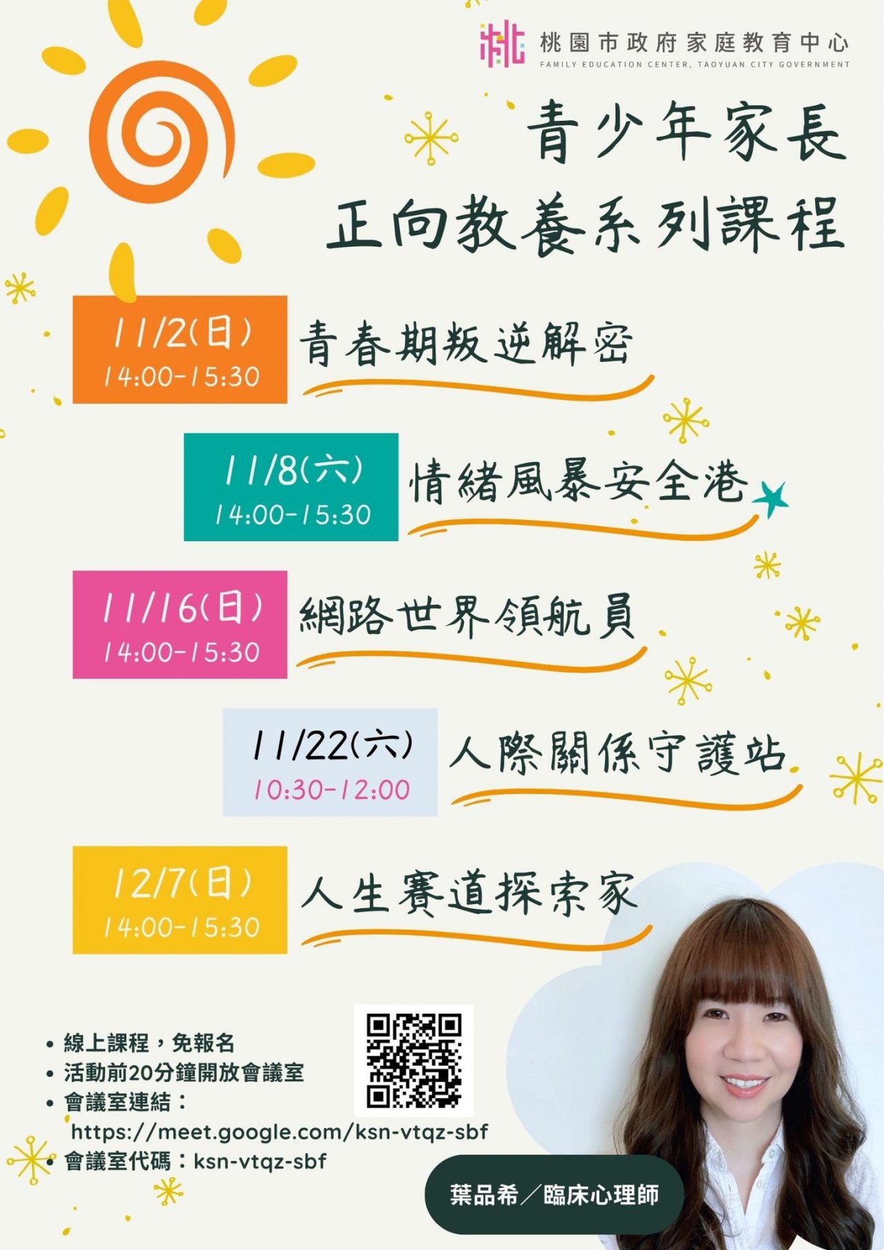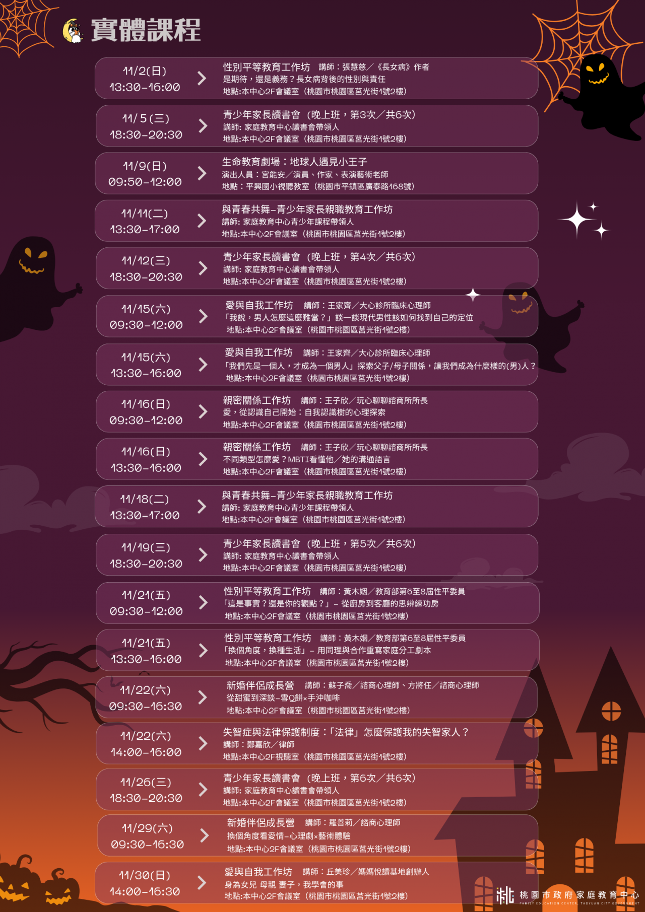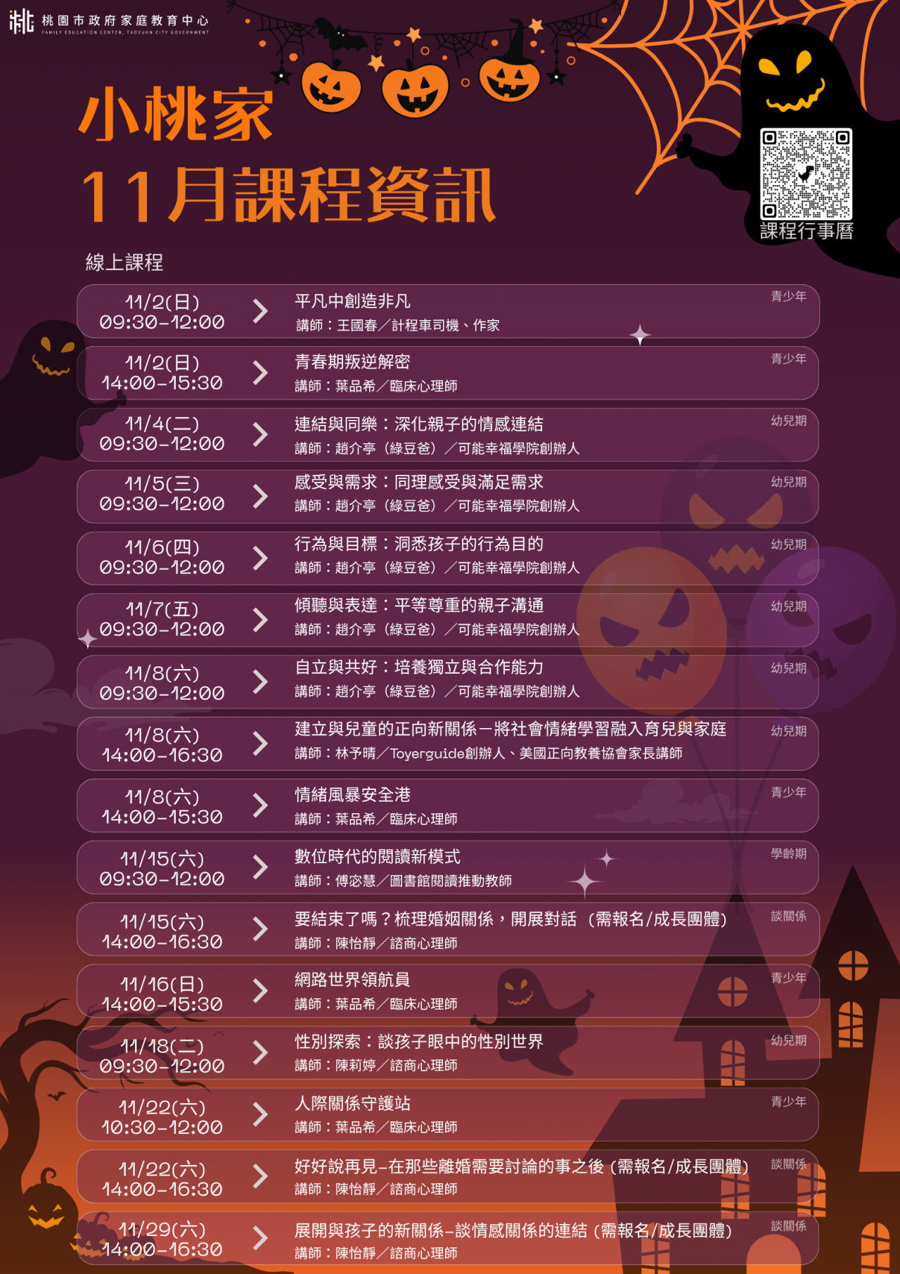 | 「小桃家11月課程資訊」、「青少年家長正向教養」、「邁向下一站幸福成長團體」、「學齡前的幸福教養」、「青少年家長親職教育工作坊」相關訊息,歡迎踴躍參加。 |