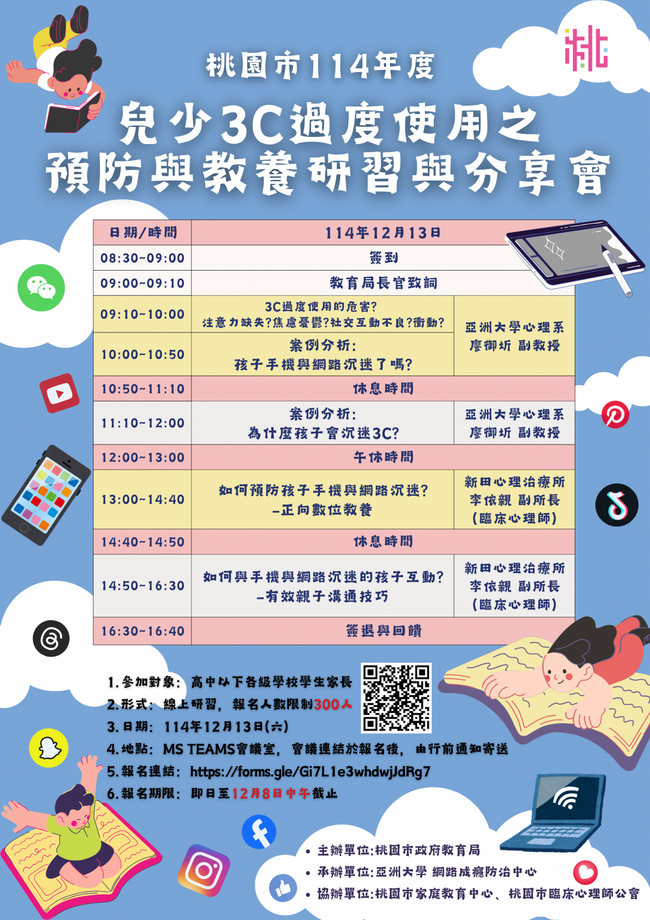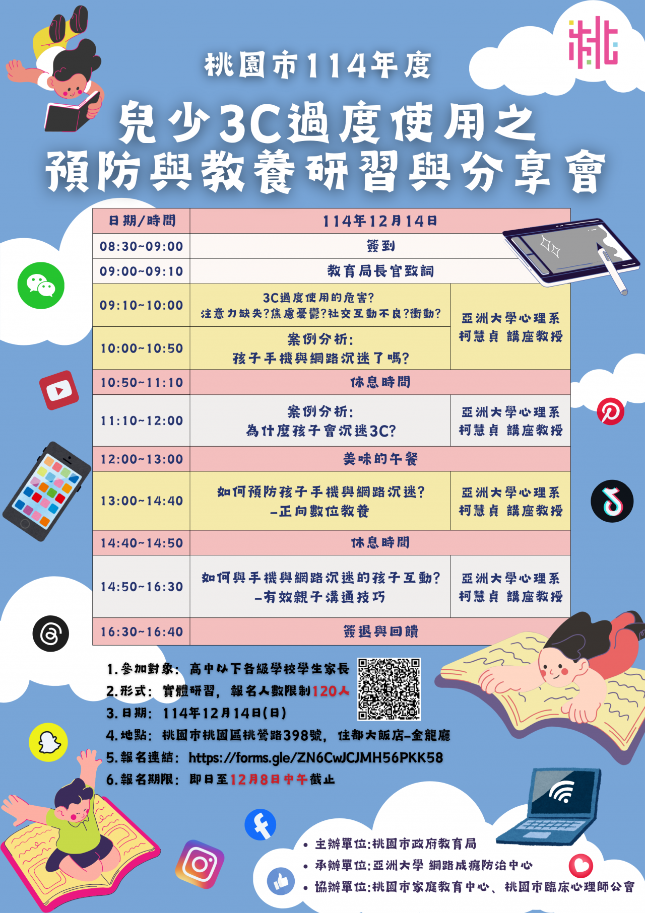 | 亞洲大學網路成癮防治中心辦理本市114年度「兒少3C過度使用之預防與教養研習與分享會」歡迎家長踴躍報名。 |