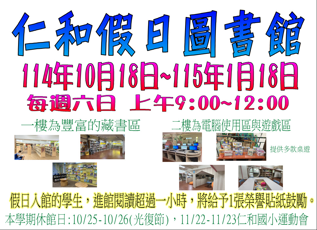 本週六日因應仁和國小運動會,所以休館2天,請大家見諒,謝謝。