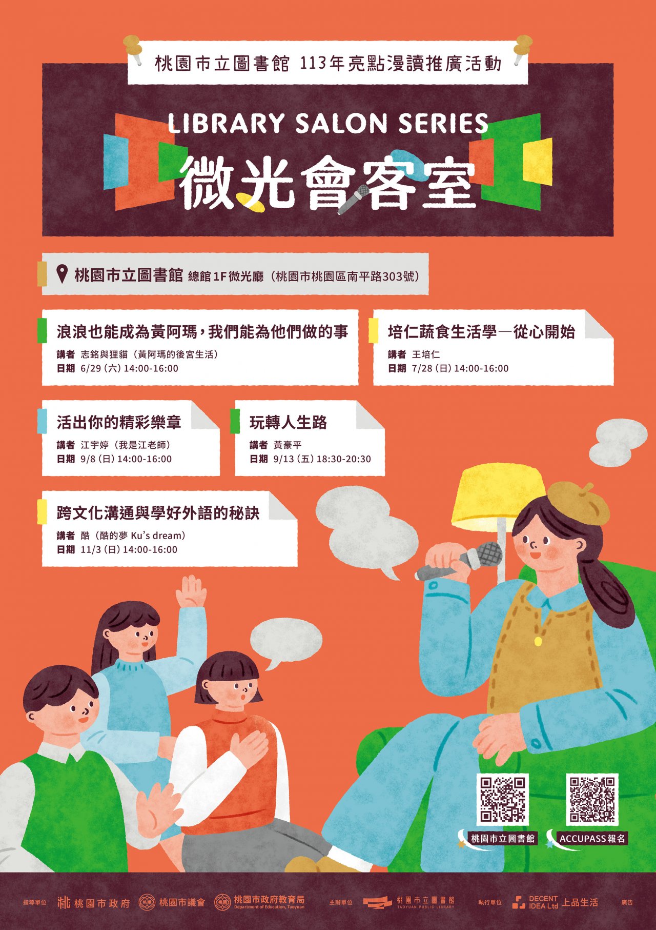 | 一、 | 為活絡桃園閱讀城市形象,透過創意亮點行銷閱讀推廣,建立全齡化閱讀風氣,本館於今(113)年6月至11月間辦理一系列講座,邀請市民朋友一起走進閱讀時光,開拓生活視野建立多元價值。 |